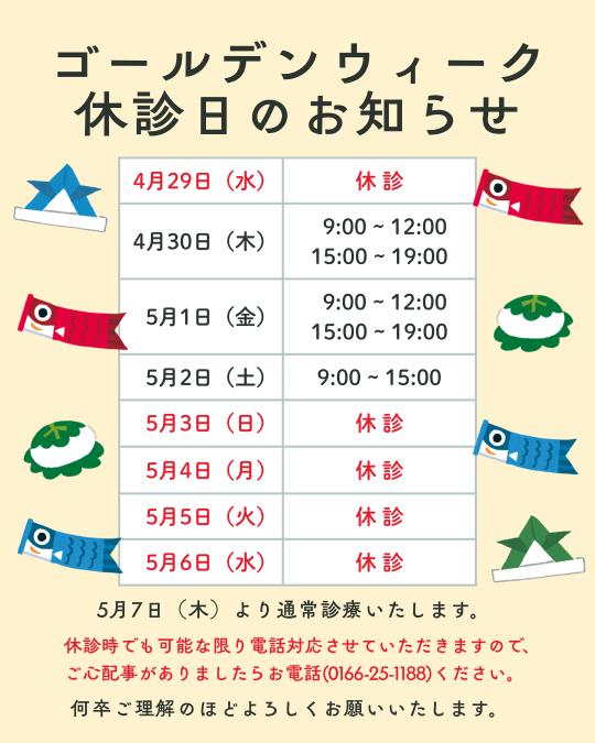 ゴールデンウィークの休診日のお知らせ ゴールデンウィークの休診日についてご案内です。休診時でも可能な限り電話対応させていただきますので、ご心配事がありましたらお電話ください。 ご不便をおかけしますが、 ご理解のほどよろしくお願いいたします。